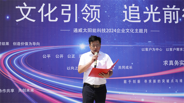 文化引領(lǐng),追光前行。5月9日,通威太陽能科技順利舉辦2024年企業(yè)文化主題月啟動儀式。通威股份總裁助理、通威太陽能科技有限公司總經(jīng)理蕭圣義,通威太陽能(鹽城)有限公司副總經(jīng)理翟緒錦,通威太陽能(四川)有限公司總經(jīng)理助理朱劍誠,通威太陽能(合肥)有限公司總經(jīng)理助理李冬生,通威太陽能科技有限公司總經(jīng)理助理胡宇慧、葉龍,南通基地負(fù)責(zé)人及通威太陽能科技各基地管理干部和員工代表共計130余人出席本次活動。