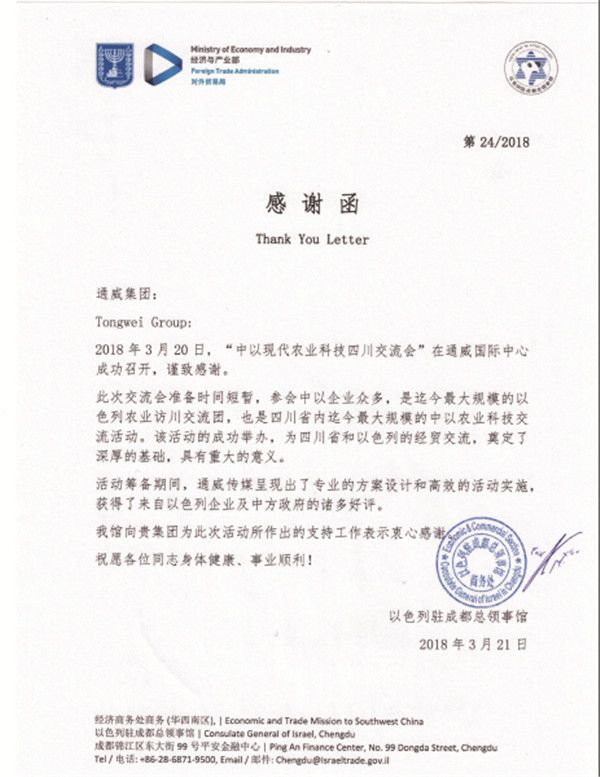 以色列駐成都總領事館感謝函