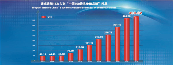 36年來(lái),在十一屆全國(guó)政協(xié)常委、全國(guó)人大代表、通威集團(tuán)董事局劉漢元主席的高度重視和親自帶領(lǐng)下,通威品牌建設(shè)創(chuàng)新探索、與時(shí)俱進(jìn)、碩果累累,社會(huì)認(rèn)知度、美譽(yù)度逐年增強(qiáng)。從2004年的19億元,到2018年一舉突破550億元,通威品牌建設(shè)不斷刷新歷史新高。伴隨著集團(tuán)雙主業(yè)的發(fā)展壯大,15年來(lái),通威品牌價(jià)值增長(zhǎng)近30倍,充分展示了全國(guó)乃至全球綠色農(nóng)業(yè)和綠色能源領(lǐng)軍品牌的雄厚實(shí)力。