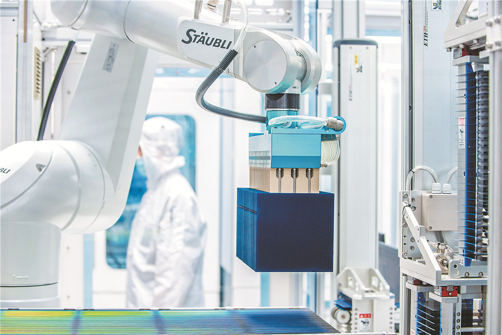 4月21日,通威太陽能眉山公司一期高效晶硅電池項目投產暨二期項目開工儀式在眉山市東坡區隆重舉行。通威太陽能眉山一期7.5GW電池產量,每年將會節約350萬噸石油的消耗,10年生產的產品將會節約3500萬噸石油的消耗。A1車間建筑面積8萬平方米,是目前全球單車間建筑面積最大、產能規模最大的電池車間。其中共有16條全封閉的智能制造高效晶硅電池片自動化生產線高速運轉,均由自動抓取的機械臂、智能運輸機器人組成,全部生產大尺寸電池片,打造全球智能化程度最高、量產轉換效率最高、節能環保的綠色工廠。