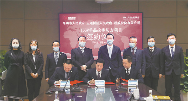 2020年12月16日,通威股份15GW單晶拉棒切方項目簽約儀式在成都通威國際中心成功舉行。通威股份與樂山市人民政府、五通橋區人民政府正式簽訂《通威股份15GW單晶拉棒切方項目》協議。樂山市委副書記、市長張彤,十一屆全國政協常委、全國人大代表、通威集團董事局劉漢元主席,樂山市副市長廖克全,五通橋區委副書記、區長李良,永祥股份副總經理袁中華,永祥硅材料副總經理張軍等領導出席簽約儀式。