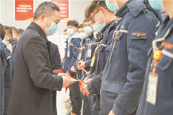 1月21日除夕夜,在永祥新能源廠區(qū),通威股份副總裁、永祥股份總經(jīng)理、永祥新能源總經(jīng)理李斌向值守員工送上春節(jié)祝福和暖心禮物,感謝大家為公司發(fā)展所做出的努力。李總表示,新春佳節(jié),大家不能與家人團聚,選擇了和公司在一起,展現(xiàn)了“舍小家,顧大家”的永祥精神。希望大家值班期間,要做到“我的崗位我負責,我的工作請放心”,用實際行動為公司安全穩(wěn)定生產(chǎn)保駕護航。