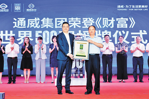 8月2日,2023年《財富》世界500強榜單全球發(fā)布。通威集團首次榮列榜單,實現(xiàn)四川制造業(yè)世界500強企業(yè)“零”的突破,并成為全球光伏行業(yè)首家世界500強企業(yè)!當(dāng)天,通威集團榮登《財富》世界500強授牌儀式在通威國際中心隆重舉行。各級政府領(lǐng)導(dǎo)、財富傳媒集團領(lǐng)導(dǎo)及嘉賓、海內(nèi)外通威人通過線上線下方式,共同見證這一歷史性時刻!期間,四川省委常委、統(tǒng)戰(zhàn)部部長趙俊民蒞臨通威調(diào)研。趙俊民常委祝賀通威集團榮登《財富》世界500強,充分肯定了通威集團對四川省綠色經(jīng)濟發(fā)展作出的突出貢獻,是四川民營企業(yè)的典范,并勉勵公司再接再厲,把握時代發(fā)展機遇,在更廣闊的世界舞臺發(fā)展壯大,充分發(fā)揮龍頭引領(lǐng)作用,積極推動地方經(jīng)濟社會發(fā)展,在助推四川高質(zhì)量發(fā)展中展現(xiàn)更大作為!