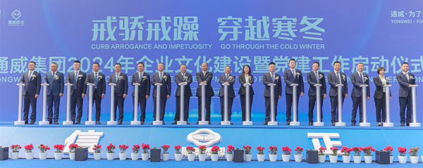 3月22日,通威集團2024年企業(yè)文化建設(shè)暨黨建工作啟動儀式在永祥股份樂山基地隆重舉行。啟動儀式以“戒驕戒躁 穿越寒冬”為主題,總結(jié)2023年企業(yè)文化建設(shè)成果,部署2024年企業(yè)文化建設(shè)工作。2024年面對新形勢、新挑戰(zhàn),通威始終堅持將優(yōu)秀文化與經(jīng)營管理相結(jié)合,號召全體通威人以更強的使命感和責(zé)任感,用心、用智慧、用只爭朝夕的精神工作,用強大的通威文化去創(chuàng)造更大更新的輝煌。