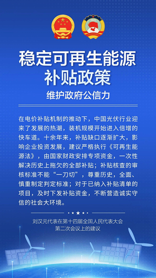 為促進(jìn)光伏、風(fēng)電等可再生能源健康穩(wěn)定可持續(xù)發(fā)展,劉漢元代表建議: