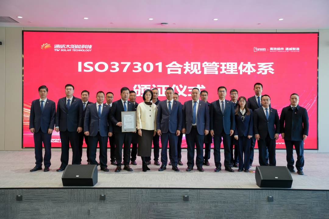 近日,通威太陽能科技鹽城基地順利舉行ISO37301合規管理體系頒證儀式。通威股份總裁助理、通威太陽能科技總經理蕭圣義,鹽城基地副總經理翟緒錦,BSI英國標準協會大中華區華南區標準方案應用總監馬涓出席儀式。此次順利通過認證,標志著通威太陽能科技鹽城基地在合規管理領域正式與國際標準接軌,為公司全球化發展與高質量運營構建起堅實保障。
