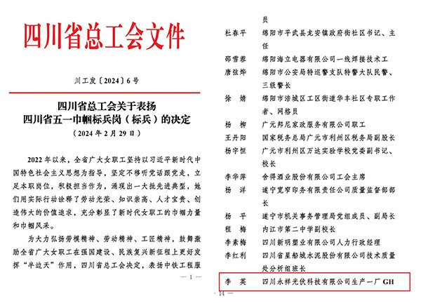 永祥光伏科技李英榮獲四川省五一巾幗標(biāo)兵