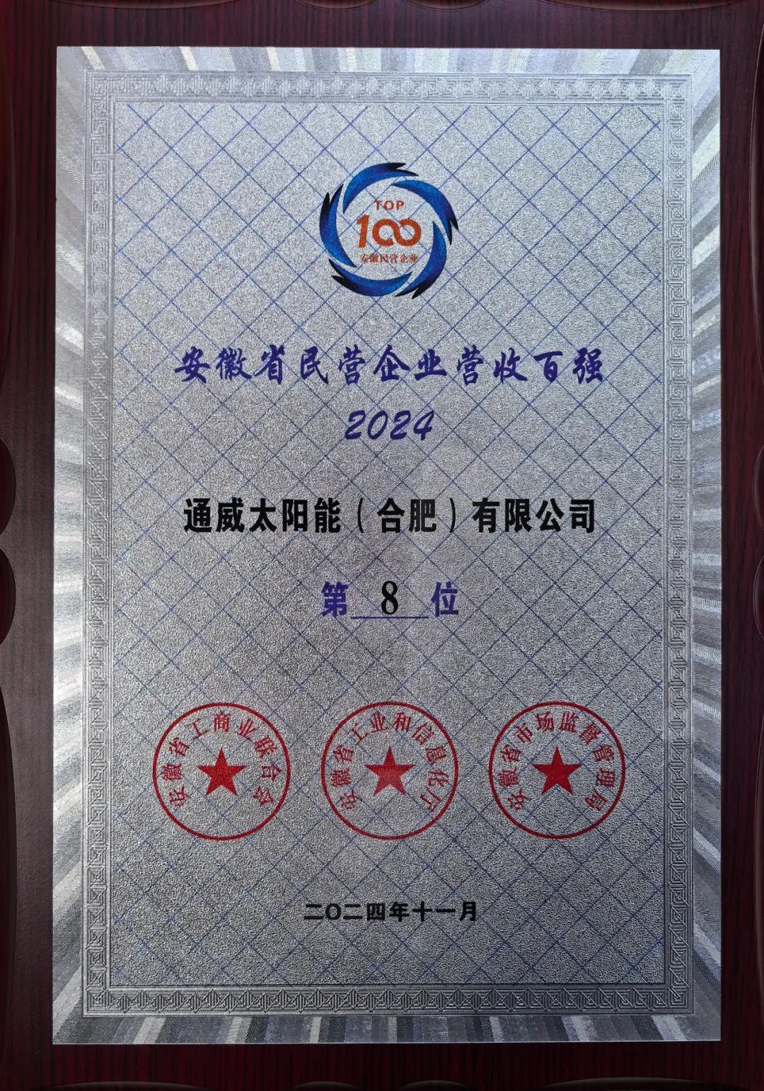 通威太陽能(合肥)有限公司連續(xù)8年榮列安徽省民營企業(yè)營收百強、制造業(yè)百強企業(yè)榜單