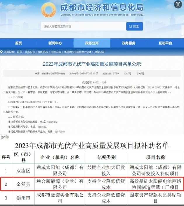 通合新能源(金堂)有限公司成功入圍成都市2023年光伏產業高質量發展項目名單