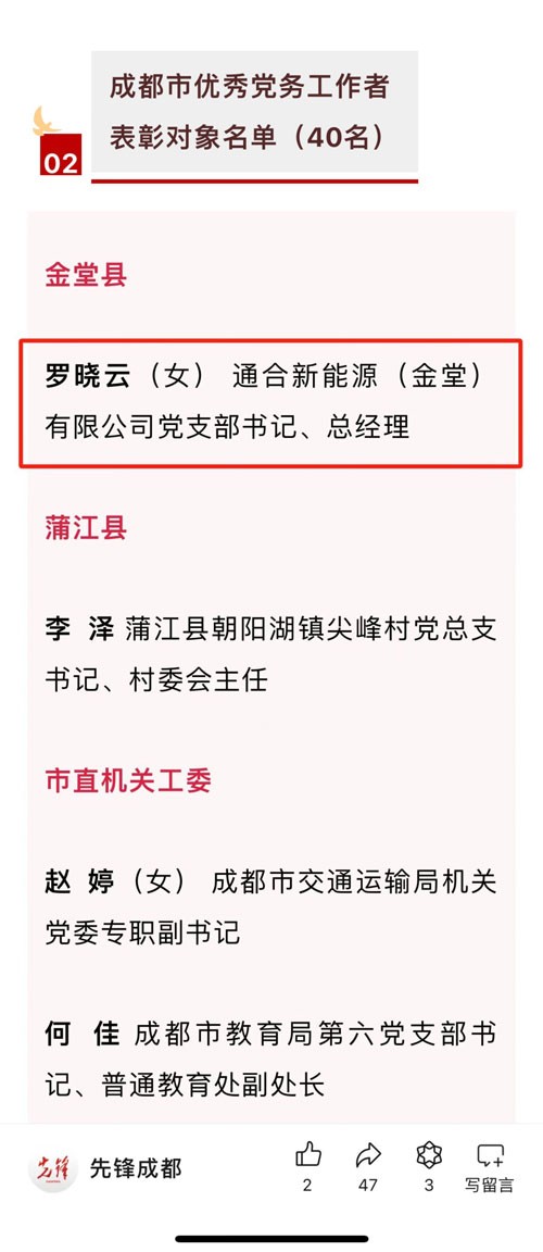 通合新能源(金堂)有限公司黨支部書記羅曉云榮獲“2024年成都市優秀黨務工作者”榮譽稱號