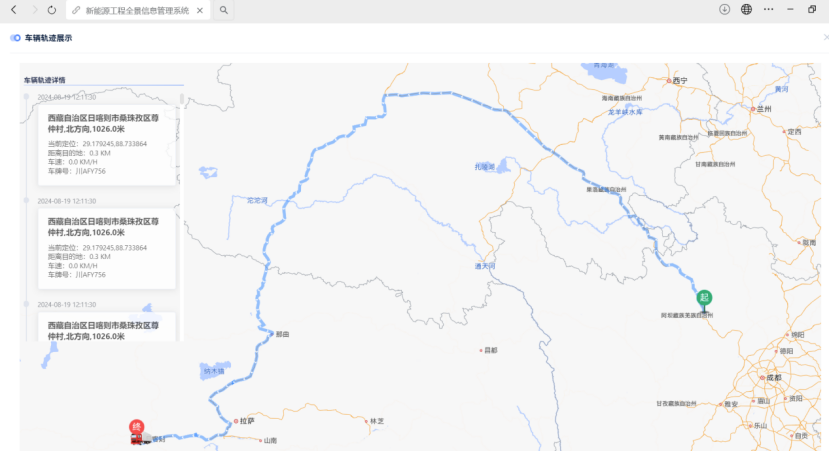 此外,通威緊密配合華電西藏能源有限公司推進其2024年度新能源數(shù)字化建設(shè)。在物資發(fā)運之前,公司率先將詳盡的運輸設(shè)備信息精準(zhǔn)錄入華電西藏新能源工程全景信息系統(tǒng)中,實現(xiàn)了運輸車輛軌跡的實時線上可視化查詢,確保了項目發(fā)貨進度的全天候動態(tài)追蹤。這一舉措顯著提升了項目管理的透明度與效率,構(gòu)建了一套完善的項目進程數(shù)字化與精細(xì)化管理機制,為保障工程進度的順利推進與項目質(zhì)量的穩(wěn)步提升奠定了基礎(chǔ)。
