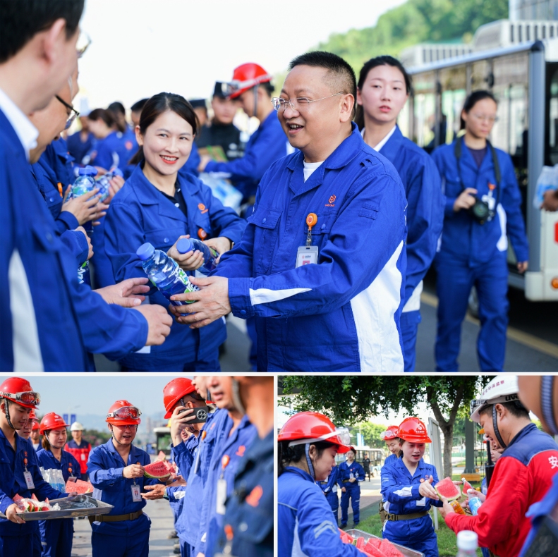 現(xiàn)場,李總和股份領(lǐng)導們親自將一瓶瓶清涼飲品和一塊塊甘甜多汁的西瓜遞到員工手中,并親切地詢問大家的工作與生活情況,反復叮囑:“天氣熱,大家一定要注意身體,多喝水,防止中暑。”這簡單卻溫暖的話語,如同夏日里的一縷清風,瞬間拂去了員工們臉上的疲憊與汗水。“感謝領(lǐng)導們的關(guān)心!”員工們的笑容是對這份關(guān)懷最好的回應。李總對所有在炎炎夏日依舊堅守在生產(chǎn)和工程建設前線的所有永祥家人們表示衷心的感謝,并叮囑大家一定要時刻緊繃安全弦,所有的工作都要以保障安全為前提,要注意安全生產(chǎn)和工程管理,做好高溫作業(yè)保護及消暑降溫工作。現(xiàn)場工作人員紛紛表示,一定會堅守崗位,履職盡責,用心工作,用智慧工作,用只爭朝夕的精神工作,為公司發(fā)展添磚加瓦。