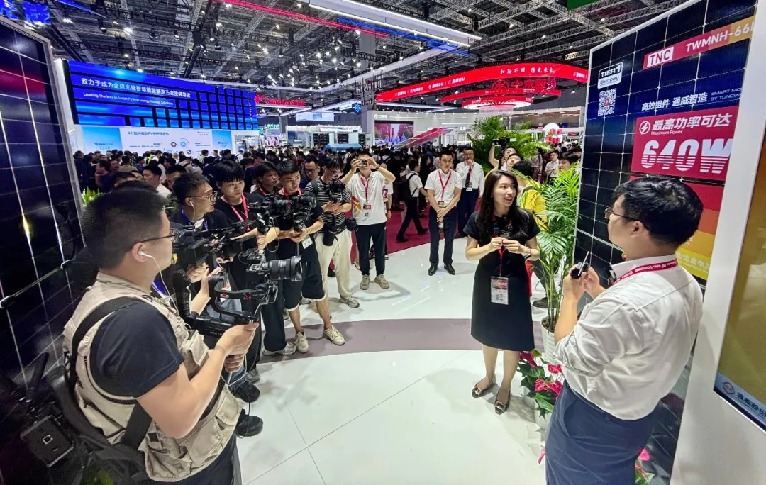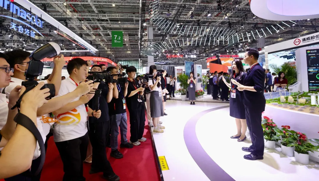 在通威展臺上的通威光伏產(chǎn)業(yè)鏈產(chǎn)品吸引了眾多媒體探展“打卡”。華夏雙碳能源研究院、世紀新能源網(wǎng)、光伏們、華夏能源網(wǎng)、北極星太陽能光伏網(wǎng)、能見、中國能源產(chǎn)業(yè)發(fā)展網(wǎng)等10家媒體,現(xiàn)場采訪通威光伏產(chǎn)業(yè)鏈上中下游相關(guān)負責(zé)人,全面了解通威高效光伏產(chǎn)品和領(lǐng)先技術(shù)實力。