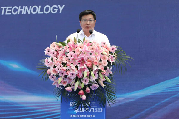祁從峰副市長在致辭中,首先代表鹽城市委、市政府向通威太陽能科技成立2周年表示衷心的祝賀,向長期以來關心和支持鹽城經濟社會發展的領導和嘉賓表示衷心的感謝,并表示,通威太陽能科技鹽城基地實現了“當年開工、當年投產、當年營收過百億”,創造了新的鹽城速度、通威速度,為鹽城晶硅光伏產業發展作出了巨大的貢獻,希望通威太陽能科技能堅定扛起時代賦予的歷史使命,持續練好內功,永葆行業領先,不斷推動產能爬坡提升,鹽城將一如既往地支持開發區不斷優化營商環境,做好重大項目保障服務,以最高的效率、最好的環境、最優的服務,支持通威向新能源賽道全面進軍,共同書寫鹽城晶硅光伏產業發展新篇章。