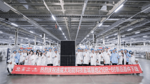 在重磅嘉賓、參會媒體的見證下,通威太陽能科技鹽城基地成功下線首件G12R-66版型組件。這是繼南通基地G12R-48版型組件下線后,通威正式實現了G12R大矩形組件的全面供應。