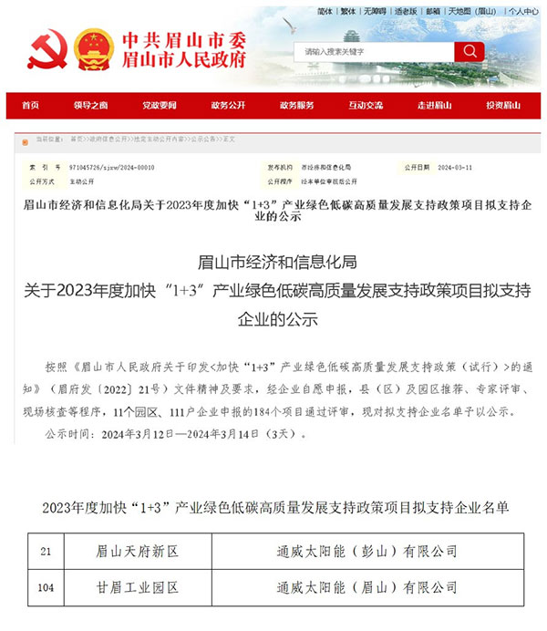 3月12日,中共眉山市委市政府官方網(wǎng)站正式公示了《2023年度加快“1+3”產(chǎn)業(yè)綠色低碳高質(zhì)量發(fā)展支持政策項(xiàng)目擬支持企業(yè)名單》,通威太陽能眉山基地、彭山基地經(jīng)自主申報(bào),通過縣(區(qū))及園區(qū)推薦、專家評(píng)審等層層審核,成功入列其中。