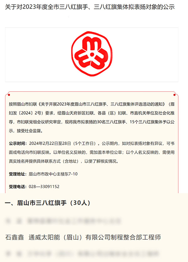為表揚在新時代為眉山現(xiàn)代化建設(shè)各項事業(yè)發(fā)展中取得優(yōu)異成績、做出突出貢獻的優(yōu)秀女性,激勵帶動廣大婦女在新時代新征程眉山現(xiàn)代化建設(shè)中貢獻巾幗力量,眉山市婦聯(lián)組織開展2023年度眉山市三八紅旗手(集體)評選活動,通威太陽能眉山基地制程整合部石鑫鑫榮獲2023年度三八紅旗手稱號。