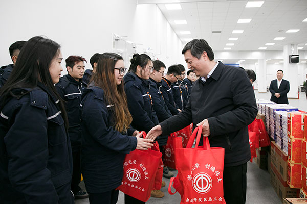 活動中,曹海峰主任與蕭總進行了親切的交流,對通威高效光伏組件項目在南通市開發區的快速落地,從打樁到投產用時不到6個月,給予了高度的評價。曹海峰主任表示,通威高效光伏組件項目不僅為南通市開發區經濟發展做出了積極貢獻,也刷新了對通威速度的認知。同時,曹海峰主任對員工過去一年的勤勞工作和默默奉獻表示了衷心的感謝。蕭總代表公司感謝開發區總工會的溫暖關心,并表示南通基地將繼續堅持求真務實,砥礪奮進,發揮其應有的經濟效益,為開發區的發展貢獻更大的價值。隨后,曹海峰主任將寓意吉祥的堅果禮盒、牛奶等慰問品送到員工手中,向公司員工致以新春的問候和祝福。
