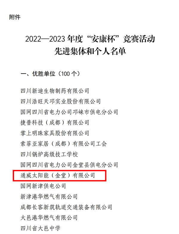 近日,成都市總工會、成都市應急管理局、成都市衛生健康委員會聯合發布《關于通報表揚2022-2023年度成都市“安康杯”競賽先進集體和個人的通知》,通威太陽能金堂基地榮獲2022-2023年度成都市“安康杯”競賽優勝單位稱號。