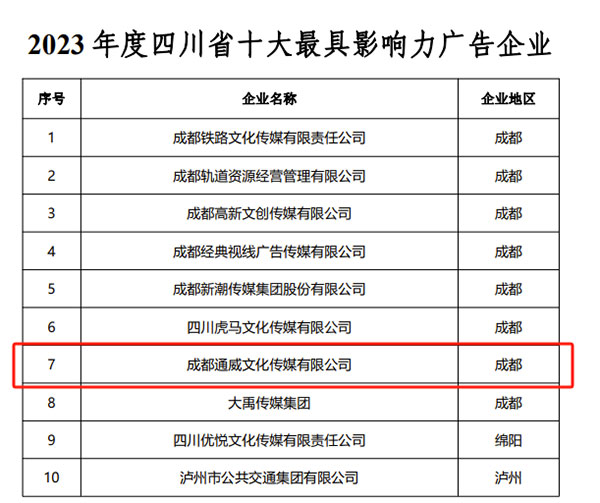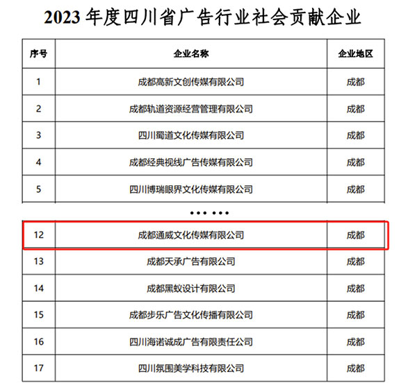 為樹立行業(yè)標(biāo)桿,打造明星廣告企業(yè),表彰在2023年度取得優(yōu)秀成績的會員企業(yè)、行業(yè)協(xié)會和個人,四川省廣告協(xié)會于去年12月開展了2023年度四川省廣告行業(yè)表彰活動。根據(jù)《評審辦法》和《初評評分標(biāo)準(zhǔn)》要求,經(jīng)評審委員會考核打分,通威傳媒獲評“四川省十大最具影響力廣告企業(yè)”“四川省廣告行業(yè)社會貢獻(xiàn)企業(yè)”兩項殊榮。