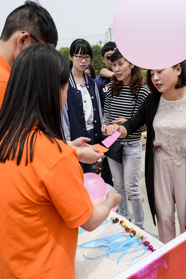 相親配飾秀環(huán)節(jié),由主人替犬只挑選鈴鐺配飾,總共12對犬只成功配對,其中不乏金毛與巨型貴賓的強(qiáng)強(qiáng)組合、金毛與小泰迪的最萌身高差組合,但是仍舊有犬只落單,所謂“關(guān)愛單身狗人人有責(zé)”,成都好主人寵物食品為配對成功的犬只頒發(fā)了同款情侶三角巾后,也特別為落單的六只單身汪送出了關(guān)愛禮品————驅(qū)蚤花露水。雖然落單,但主人及犬只臉上卻絲毫沒有不開心的表情。