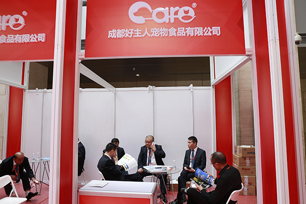 嘉賓們在成都好主人寵物食品有限公司的展臺內(nèi)翻閱好主人的資料
