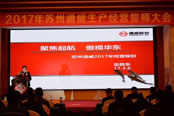 近日,蘇州通威“聚焦起航 誓傲華東”2017年誓師大會隆重召開,通威股份副總裁兼華東戰區總裁王尚文、蘇州通威總經理巫勝東、通威股份特種水產所所長陳效儒出席,蘇州通威全體員工參會。