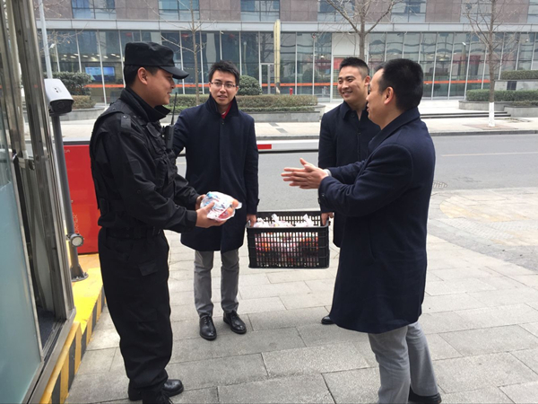 通宇物業(yè)公司總經(jīng)理助理何黎明、李俊,向春節(jié)值班人員送去劉漢元主席,管亞梅董事長的問候和祝福