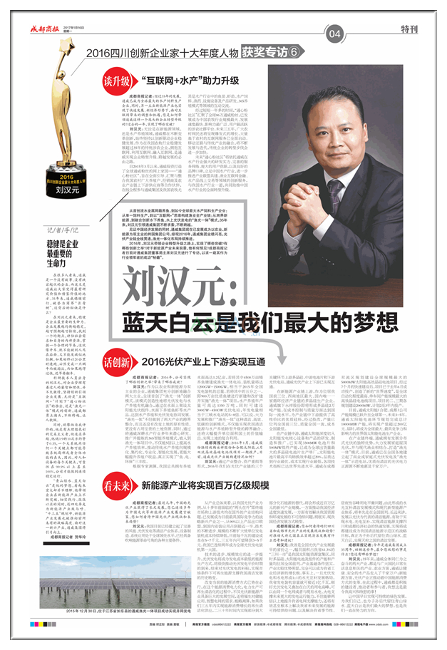 2016年,劉漢元帶領企業轉型升級之路上,實現了哪些突破?有哪些創新之舉?對于新能源產業未來前景,他有何預見?成都商報記者日前對通威集團董事局主席劉漢元進行了專訪,以求一窺其作為行業領軍者的成功“秘籍”。