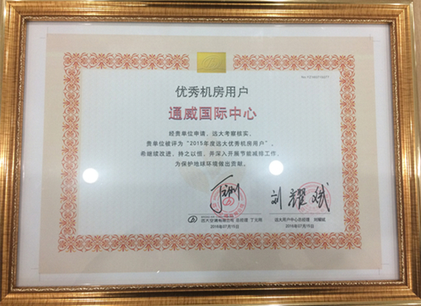 通威國際中心獲“2015年度遠(yuǎn)大優(yōu)秀機(jī)房用戶”證書