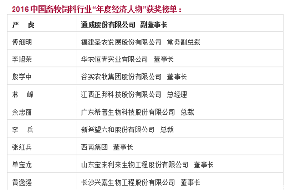 12月10日-11日,2016年第十三屆中國畜牧飼料科技與經濟高層論壇在北京會議中心隆重舉行,本次論壇由中國飼料工業協會指導,中國林牧漁業經濟學會飼料經濟專業委員會主辦。中國林牧漁業經濟學會飼料經濟專業委員會理事長蔡輝益主持論壇開幕式,十一屆全國政協常委、通威集團董事局劉漢元主席受邀致開幕詞,農業部畜牧業司副司長王俊勛致歡迎詞,全國畜牧總站站長、中國飼料工業協會常務副會長、秘書長楊振海,中國畜牧業協會常務副會長、農業部畜牧總站原站長李希榮等領導發表講話,廣大協會專家、行業領軍人物、學術界知名經濟學家等共襄盛會。通威股份嚴虎副董事長、通威股份水產技術總監張璐、通威股份總裁助理兼華北戰區總裁周澎出席論壇。論壇期間還隆重舉行了“通威杯·中國畜牧飼料年度頒獎盛典”,通威股份嚴虎副董事長榮獲“十大年度經濟人物”稱號,通威“漁光一體”養殖模式集成技術及其產業化榮獲“十大科技產業化進步獎”。