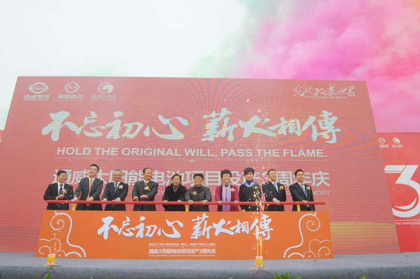 11月18日,通威太陽(yáng)能電池項(xiàng)目投產(chǎn)三周年慶在通威太陽(yáng)能(成都)有限公司廠區(qū)隆重舉行。通威大家庭的三位“大家長(zhǎng)”————?jiǎng)⒗咸珷敗罾咸⒉芾咸H臨現(xiàn)場(chǎng),十一屆全國(guó)政協(xié)常委、通威集團(tuán)董事局劉漢元主席,通威集團(tuán)管亞梅董事長(zhǎng),通威集團(tuán)副總裁胡榮柱,通威集團(tuán)副總裁黃其剛,通威集團(tuán)財(cái)務(wù)總監(jiān)肖吉華,通威太陽(yáng)能(合肥、成都)有限公司董事長(zhǎng)謝毅,通威股份董事、永祥股份董事長(zhǎng)兼總經(jīng)理段雍,通威集團(tuán)財(cái)務(wù)部部長(zhǎng)高原柏,通威集團(tuán)人力資源部部長(zhǎng)易繼成,深圳通威新能源有限公司總經(jīng)理鄧衛(wèi)平等領(lǐng)導(dǎo)出席慶典儀式,通威太陽(yáng)能(合肥、成都)有限公司全體高管、成都公司員工及家屬代表參加儀式,合肥公司同步進(jìn)行視頻連線。