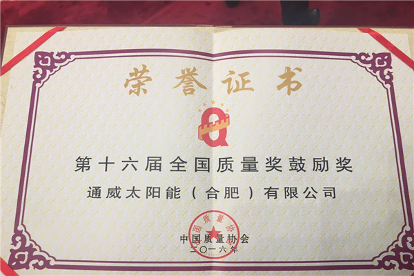 通威太陽能(合肥)有限公司從2014年引入卓越績效管理模式至今,積極參與各項質量活動,分別在2015年獲得合肥市五星級班、2015年安徽省質量獎;2016年獲得安徽省QC小組一等獎,此次又獲得了全國質量獎鼓勵獎,公司將以此次獲獎為契機,夯實基礎,全面提升各項管理水平,力爭獲得更高質量獎項,樹立光伏行業品質標桿。