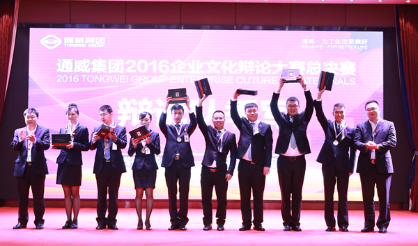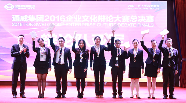 在央視名嘴劉棟棟的主持下, 總決賽于下午13時(shí)30分正式拉開序幕,從各輪初、復(fù)賽中脫穎而出的十強(qiáng)戰(zhàn)隊(duì)集結(jié)于此,圍繞“企業(yè)員工的忠誠(chéng)與能力,誰更重要?”、“企業(yè)成功是必然還是偶然?”、“企業(yè)管理人性化和剛性化誰更重要”等辯題,分五組展開了最后角逐,向總冠軍發(fā)起沖刺。經(jīng)過四個(gè)多小時(shí)的攻防對(duì)峙,十強(qiáng)戰(zhàn)隊(duì)為現(xiàn)場(chǎng)觀眾獻(xiàn)上了一部精彩紛呈的論辯“大片”。臺(tái)上,選手們邏輯清晰,思維敏捷,一展風(fēng)采;臺(tái)下,各拉拉隊(duì)卯足勁為臺(tái)上辯手吶喊助威。大賽專家評(píng)委組根據(jù)各辯手的現(xiàn)場(chǎng)表現(xiàn),綜合考量其辯論水平、表達(dá)能力和臨場(chǎng)狀態(tài)以及團(tuán)隊(duì)配合情況,評(píng)選出優(yōu)勝團(tuán)隊(duì)和個(gè)人獎(jiǎng)項(xiàng)。其中,總部第二戰(zhàn)隊(duì)拔得頭籌,斬獲“通威集團(tuán)2016企業(yè)文化辯論大賽冠軍”殊榮。