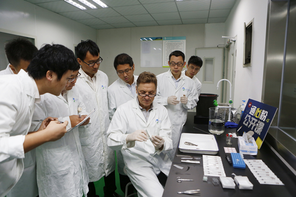 交流期間,布克曼教授就“魚類小瓜蟲病綜合防治技術(shù)研發(fā)和應(yīng)用”、“全球水產(chǎn)品生產(chǎn)帶來(lái)的疾病挑戰(zhàn)”等問(wèn)題與動(dòng)保所技術(shù)人員進(jìn)行了深入研討,并參觀了依托通威股份建立的國(guó)家級(jí)工程實(shí)驗(yàn)室————水產(chǎn)養(yǎng)殖動(dòng)物疾病防控國(guó)家地方聯(lián)合工程實(shí)驗(yàn)室。布克曼教授對(duì)實(shí)驗(yàn)室的建設(shè)情況及研究成果給予了高度肯定,并表示希望通威能與哥本哈根大學(xué)強(qiáng)強(qiáng)聯(lián)手,一起攻克疑難魚病。