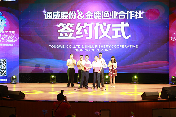 9月20日晚上9時(shí)30分,現(xiàn)場(chǎng)迎來(lái)又一輪高潮,通威股份與金鹿?jié)O業(yè)合作社現(xiàn)場(chǎng)舉行簽約儀式。通威股份郭異忠總裁、金鹿?jié)O業(yè)合作社理事長(zhǎng)高李松上臺(tái)簽約。郭異忠總裁表示,很榮幸能夠與現(xiàn)代科技型農(nóng)民專業(yè)合作經(jīng)濟(jì)組織金鹿?jié)O業(yè)簽約,通威與金鹿?jié)O業(yè)之前就有合作,這次簽約標(biāo)志著雙方合作更上一個(gè)臺(tái)階,為未來(lái)推進(jìn)“漁光一體”項(xiàng)目鋪平道路,共謀發(fā)展。金鹿?jié)O業(yè)合作社高總則感慨表示,經(jīng)過(guò)十年時(shí)間,終于加入通威,希望在通威的懷抱里繼續(xù)遠(yuǎn)航。
