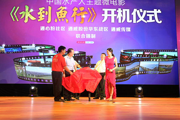 晚會(huì)同時(shí)舉行了水產(chǎn)界首部微電影《水到魚行》的開機(jī)儀式。十一屆全國(guó)政協(xié)常委、通威集團(tuán)董事局劉漢元主席,通威集團(tuán)副總裁黃其剛,通威股份副總裁兼華東戰(zhàn)區(qū)總裁王尚文,及該片男主角原型、“通心粉之星”翁漢良,女主角“美人魚”王芊共同上臺(tái),揭開紅綢,宣布該影片正式開機(jī)。
