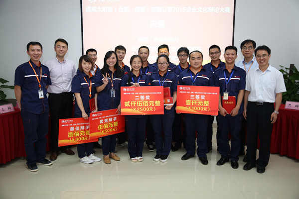 8月10日,通威太陽能(合肥、成都)有限公司2016年企業(yè)文化辯論大賽決賽在通威太陽能(成都)有限公司隆重舉行。通威太陽能(合肥、成都)有限公司董事長謝毅到場“觀戰(zhàn)”,公司高管、中干團隊擔(dān)任評委。
