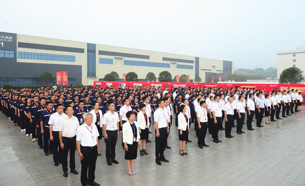 熠熠生輝的新門牌、整潔筆直的柏油路、郁郁蔥蔥的綠化帶,竣工后的通威太陽能(成都)有限公司以全新面貌亮相,一片生機盎然的景象。升旗廣場上精心布置的展板,張張圖片猶如“回放”,生動再現了通威太陽能(合肥、成都)有限公司一路走來的發展歷程。上午8點,在集團、股份高管團隊的帶領下,通威太陽能(成都)有限公司全體員工以統一著裝、整齊的隊伍、飽滿的精神狀態進行了莊嚴的升旗儀式,并全體齊唱《通威之歌》。