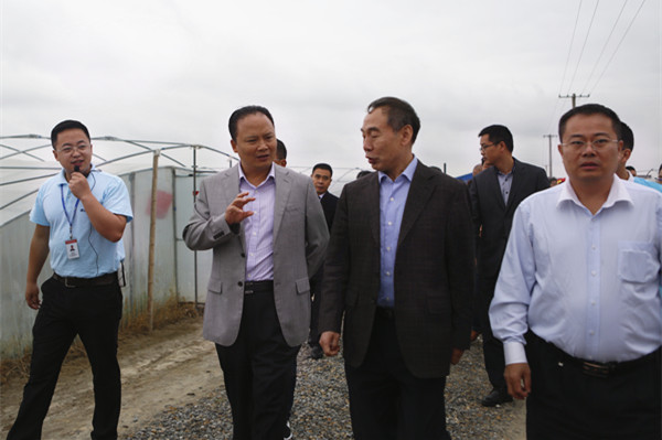 劉漢元主席與全國水產(chǎn)技術(shù)推廣總站李可心副站長(右二)一行視察如東溫棚蝦基地