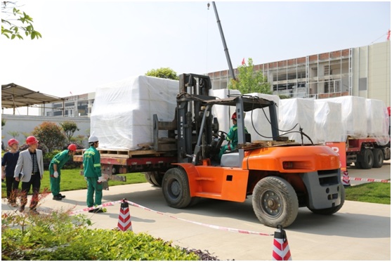 “現(xiàn)在103廠房環(huán)氧地坪還處于養(yǎng)護(hù)期,設(shè)備只能暫時性存放在露天廣場,為了100%保障設(shè)備安全,我們提前準(zhǔn)備了彩條布,整體覆蓋設(shè)備,防雨防曬。”一邊給記者介紹,何堂貴一邊目不轉(zhuǎn)睛的盯著叉車裝卸。