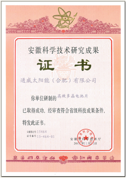 通威太陽(yáng)能(合肥)有限公司產(chǎn)品獲“安徽科學(xué)技術(shù)研究成果”證書