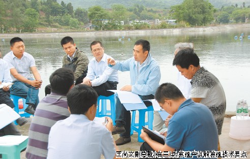 5月15日-16日上午,通威股份副總裁、市場營銷總監(jiān)兼技術(shù)總監(jiān)王尚文,股份副總裁、四川片區(qū)總裁兼四川通威總經(jīng)理陳平福,設(shè)施漁業(yè)工程研究所名譽所長吳宗文,水產(chǎn)市場部副部長楊建波等一行19人調(diào)研當(dāng)?shù)厥袌觥M蹩倢λ拇ㄆ瑓^(qū)仁壽、雙流的6個示范點的工作開展、實施、進度情況,逐一進行了全面詳細地檢查。根據(jù)示范塘養(yǎng)殖條件,分別提出了每個示范點的養(yǎng)殖目標(biāo)及相應(yīng)改進措施。