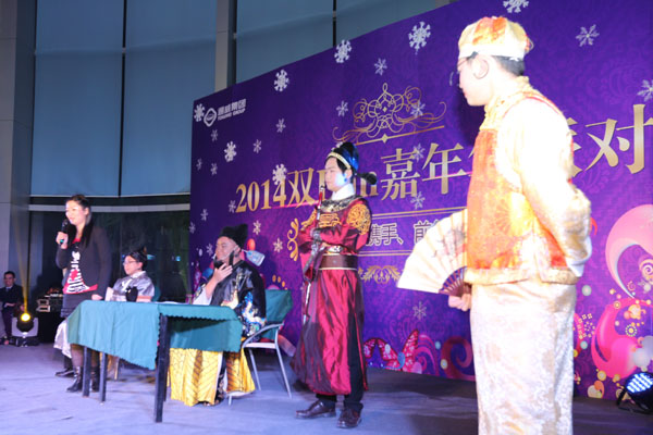 在幸福的回答過后,集團2014慶圣誕迎元旦嘉年華派對又給現場觀眾安排了近距離參與《非誠勿擾》的機會。忸怩著婀娜多姿的身軀,邁著小碎步,五位國色天香的佳麗,手拿心形燈,擺著各種poss隆重登場。“今天這個征婚啊!一定要高帥富,什么屌絲啊!什么……”在佳麗自爆招婿標準之后,上臺來征婚的“官人們”著急了。其中,一位“大人”更是直言,“傷不起”。在一番深情的表白之后,佳麗們都“不屑”。此時,臺下的觀眾著急了,紛紛喊出:嫁了吧!嫁了吧……
