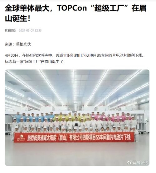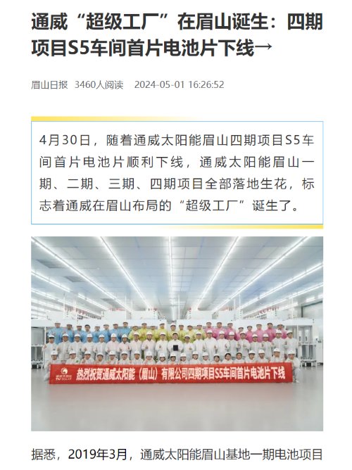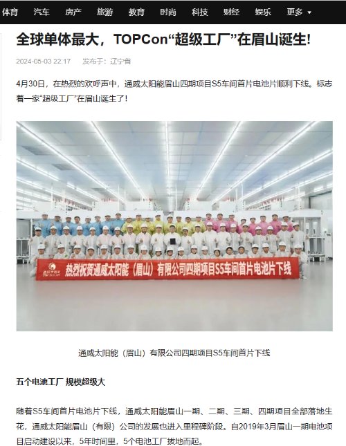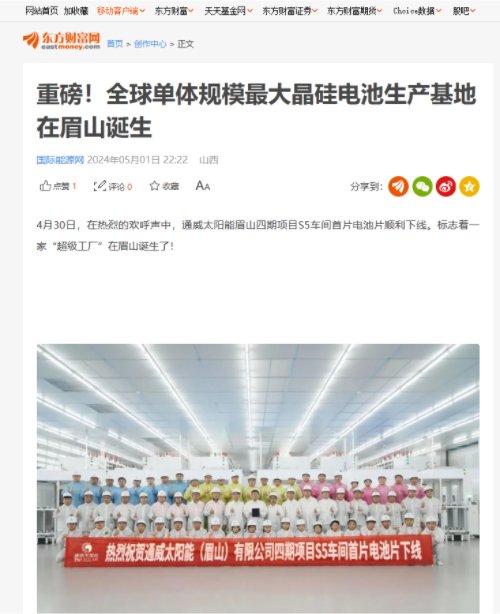 近日,新浪財經、搜狐網、東方財富網、眉山日報等多家主流媒體先后對通威太陽能眉山四期項目S5車間首片電池片順利下線進行報道,聚焦通威TOPCon“超級工廠”在眉山誕生!