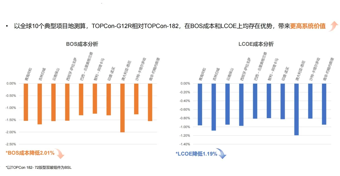 在設計方面,TNC-G12R-66組件在寬度維持1134mm的情況下,將長度由2278mm提升至2382mm,使得安裝更加便捷,集裝箱利用率高達98.5%,充分利用空間降低運輸成本,較182-72組件車裝載量提高4%,顯著降低工商業、戶用等分布式項目BOS成本。實證數據表明,TNC-G12R組件可降低BOS成本2.01%,降低LCOE 1.19%。