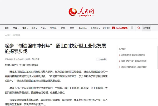2月18日,人民網、《四川日報》發表題為《起步“制造強市沖刺年” 眉山加快新型工業化發展的探索步伐》的文章,聚焦通威太陽能眉山基地春節期間不停工、熱火朝天沖刺開門紅。