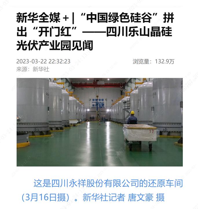 3月22日,新華社以《“中國綠色硅谷”拼出“開門紅”——四川樂山晶硅光伏產業園見聞》為題,報道了樂山晶硅光伏穩定生產經營的良好態勢,聚焦永祥在晶硅光伏領域綠色高質量發展。