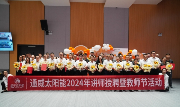為進一步聚焦員工發(fā)展、強化企業(yè)文化輸出,弘揚“師帶徒”文化、營造尊師重教的企業(yè)氛圍,9月10日,通威太陽能成功舉辦了2024年講師授聘暨教師節(jié)活動。西南石油大學新能源與材料學院副院長王平、西南石油大學光伏產(chǎn)業(yè)技術(shù)研究院辦公室主任馬廣興作為特邀嘉賓出席活動。通威太陽能副總經(jīng)理王耀頤、通合公司總經(jīng)理羅曉云、中威公司總經(jīng)理郭寬新、彭山公司總經(jīng)理顧峰、眉山公司總經(jīng)理姚騫、成都公司總經(jīng)理徐濤及各公司講師團隊共200余人參加此次活動。