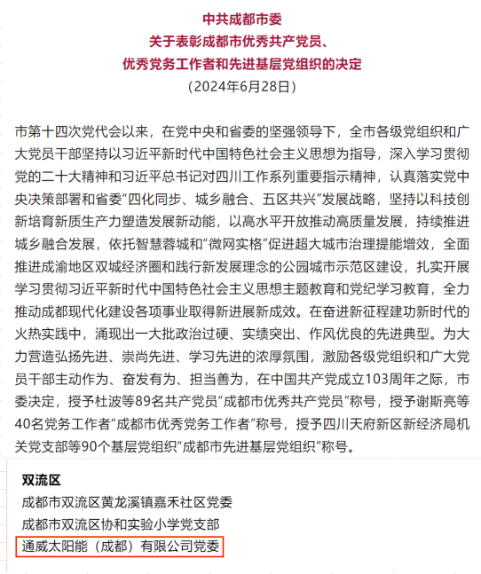 1 通威太陽能眉山公司黨總支書記姚騫 榮獲“四川省優秀共產黨員”稱號 在慶祝中國共產黨成立103周年之際,近日,中共四川省委發布關于表彰四川省“兩優一先”的決定,通威太陽能(眉山)有限公司黨總支書記姚騫榜上有名,榮獲“四川省優秀共產黨員”稱號,眉山市僅有3名黨員獲此榮譽。 榮譽證書 作為公司黨總支書記,姚騫同志在崗期間始終堅持打造“風清氣正”的工作風氣;作為公司總經理,在眉山公司建設前期,姚騫同志經過大量調研與綜合考量,確定了設備配置、工藝路線和組織架構,帶領技術團隊,在國內首次將所有生產設備進行國產化改造升級,在國內首次批量使用鏈式氧化疊加堿拋工藝技術,在行業內首次使用推廣210尺寸、182尺寸、166尺寸三種規格電池兼容設備,并首次在通威做到Topcon量產,在光伏行業內創造了無數個第一,為眉山市光伏新能源發展做出了突出貢獻。 展望未來,通威太陽能眉山公司黨總支將繼續堅持黨建帶動生產經營共同發展,挖掘優秀黨員帶頭表率潛力,助力眉山公司更全面地參與到眉山高質量發展示范工作中去,為眉山的繁榮作出更大貢獻。 2 通威太陽能成都公司黨委及黨員 榮獲“成都市先進基層黨組織”等榮譽 在中國共產黨成立103周年之際,成都市委、雙流區委公布了“兩優一先”表彰名單,通威太陽能(成都)有限公司黨委榮獲“成都市先進基層黨組織”,黨員羅蘭同志榮獲“雙流區優秀黨務工作者”稱號。 表彰截圖 本次榮獲“兩優一先”表彰,是上級黨委對成都公司黨委“黨建引領公司高質量發展”成效的高度肯定,全面反映了習近平新時代中國特色社會主義思想在蓉城大地落地生根的生動實踐,有力彰顯了新時代共產黨人立足崗位作貢獻、真抓實干顯擔當的優秀品質和精神風貌。通威太陽能成都公司黨委將以此為契機,珍惜榮譽、再接再厲,奮勇拼搏、沖鋒在前,為黨和人民的事業作出新的更大貢獻! 表彰截圖 3 通合新能源公司黨支部書記羅曉云 榮獲“成都市優秀黨務工作者”稱號 黨員及黨組織榮獲淮州新城表彰 7月1日,中共成都市委、淮州新城發布了關于表彰“兩優一先”的決定,通合新能源(金堂)有限公司黨支部書記羅曉云榮獲2024年“成都市優秀黨務工作者”稱號,通合新能源黨支部榮獲“淮州新城先進基層黨組織”,黨員王沙、陳日強同志分別榮獲“淮州新城優秀共產黨員”“淮州新城優秀黨務工作者”稱號。 表彰截圖 作為公司黨支部書記和總經理,羅曉云同志堅持嚴把政治方向,創新黨建引領,不斷探索新形勢下,適合公司發展特點的黨建工作方法,促進高質量黨建引領企業高質量發展,帶領公司獲評成都市2023年度制造強市工作先進集體、金堂縣經濟發展突出貢獻企業名單等多項榮譽。 榮譽證書 此次多項獲獎是對通合新能源(金堂)有限公司黨支部工作的極大肯定與鼓舞,鞭策全體黨員繼續不忘初心,砥礪前行。下一步,通合新能源(金堂)有限公司黨支部將以本次表彰為契機和新起點,繼續在上級黨委、集團黨委的堅強領導下,進一步發揮公司“兩優一先”的示范帶頭作用,激勵廣大黨員和干部員工開拓進取、迎難而上,推動黨建工作與生產經營融合發展,為全力推進“成東中心、公園水城”建設、奮力建設全國綠色低碳高質量發展示范區貢獻通威力量。 4 通威太陽能金堂公司黨支部 榮獲“金堂縣先進基層黨組織”等榮譽 7月1日,在慶祝中國共產黨成立103周年之際,為表彰先進、鮮明導向,在全縣營造干事創業、奮發有為的濃厚氛圍,中共金堂縣委、淮州新城發布了關于表彰“兩優一先”的決定,授予通威太陽能(金堂)有限公司黨支部“金堂縣先進基層黨組織”稱號,“淮州新城先進基層黨組織”稱號,黨員許鴻雁、魏飛同志榮獲“淮州新城優秀共產黨員”稱號,漆剛同志榮獲“淮州新城優秀黨務工作者”稱號。 表彰截圖 通威太陽能(金堂)有限公司黨支部堅持“黨旗匯聚紅心·黨建引領聚能”,主動融入金堂縣、淮州新城綠色低碳高質量發展大局中,充分發揮晶硅光伏產業鏈鏈主企業輻射帶動和基層黨組織的示范引領作用,依托“通威·紅色聚能家”黨群品牌,團結引領黨員群眾積極探索創新、主動作為,為“雙碳”目標貢獻通威力量。 榮譽證書 此次表揚,充分體現了金堂縣委、淮新委對通威太陽能金堂公司黨建工作的肯定和認可。未來,金堂公司黨支部將繼續貫徹落實黨和國家的各項方針政策,以受表彰先進為榜樣,充分履行民營企業的社會責任,傳承紅色基因,賡續精神血脈,銳意進取、矢志奮斗,凝聚通威力量,為“全力打造世界級太陽能光伏企業和世界級清潔能源公司”的戰略目標而奮斗! 5 通威太陽能彭山公司黨支部副書記陳南 榮獲眉山市彭山區青龍街道“優秀共產黨員” 7月1日,在中國共產黨成立紀念日之際,通威太陽能彭山公司黨支部副書記陳南榮獲眉山市彭山區青龍街道“優秀共產黨員”稱號。這一榮譽不僅是對陳南同志在黨建、工會及行政管理工作中所作成績的肯定,更是對通威太陽能彭山公司在地方經濟發展和社會進步中所做貢獻的高度認可。 表彰截圖 陳南同志作為公司黨建工作的重要推動者,帶領支部黨員深入學習黨的理論和路線方針政策,不斷提高政治素養和業務能力。在工會工作中,陳南同志積極維護員工權益,組織豐富多彩的工會活動,增強員工的幸福感和歸屬感。在行